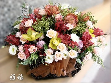粉玫瑰+萬代蘭+東亞蘭+針墊花+桔梗+小松果+尤加利